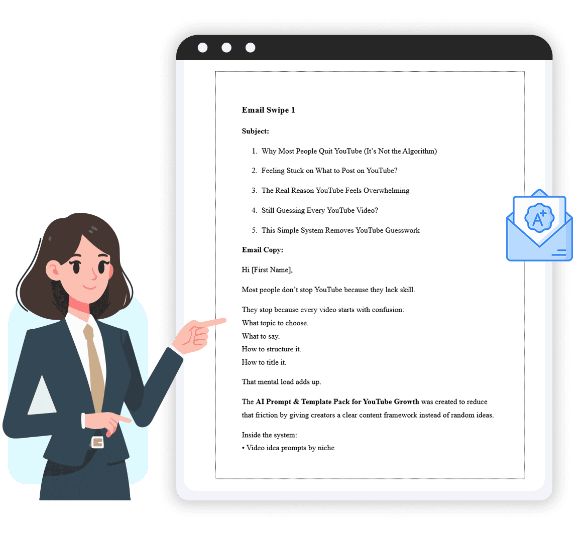 Provides pre-written email templates for announcements, follow-ups, and audience engagement. The messaging emphasizes clarity and structure, with full flexibility to adjust tone and sequencing to match your brand.