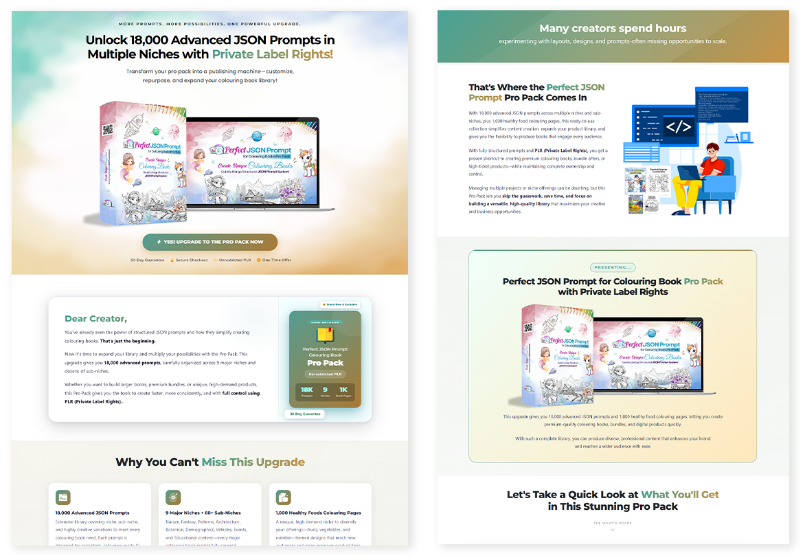 By upgrading to the Perfect JSON Prompts Colouring Book Pro Pack, you unlock 18,000 advanced, professionally structured JSON prompts, organized across multiple niches and sub-niches to support larger, more detailed colouring book projects and bundled content.