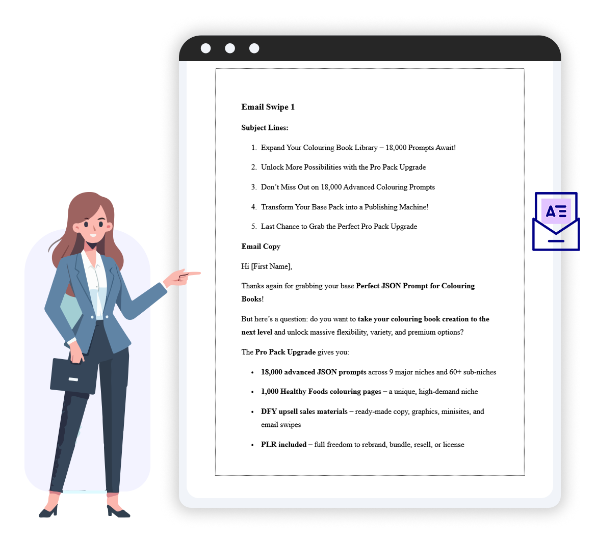 Editable email templates created to follow up with buyers after the initial purchase. These swipes help you re-engage your audience, explain the upsell value clearly, and drive additional interest without writing new emails from scratch.